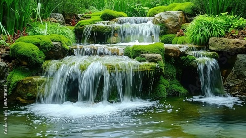 Sparkling crystal-clear waterfalls cascading down moss-covered rocks