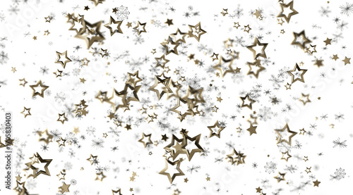 Sparkling gold stars and snowflakes on white. Festive, magical winter design.