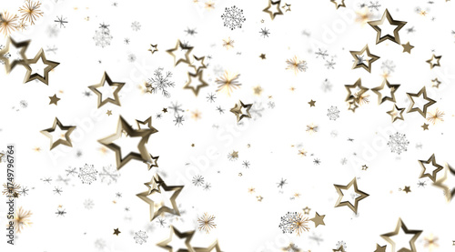 Sparkling gold stars and snowflakes on white. Perfect for holidays, celebrations, and winter themes.