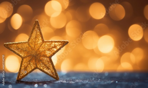 Sparkling Golden Christmas Star. Ornament Decoration Defocused Bokeh Background.