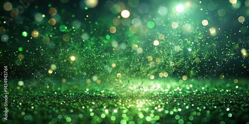 Sparkling green glitter particles suspended in mid-air against a dark background with a soft bokeh effect creating a sense of depth and mystery, bokeh effect, luminous