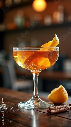 Sparkling orange cocktail with citrus garnish on wooden bar counter