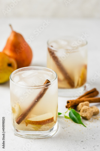 Sparkling pear cinnamon cocktail in glasses. Space for text.