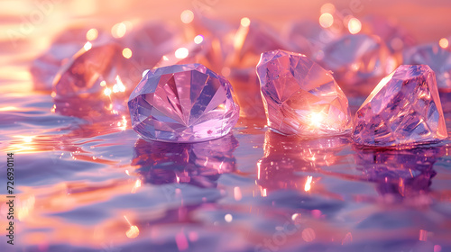 Sparkling pink diamond in water. The diamonds are pink and have a light shining on them.