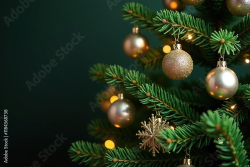 Sparkling silver and gold ornaments adorn a lush green fir tree, decorations, evergreen