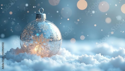 Sparkling silver glass bauble with glittering snowflakes on a snowy white background, snowy scene, frosty charm, silver accents