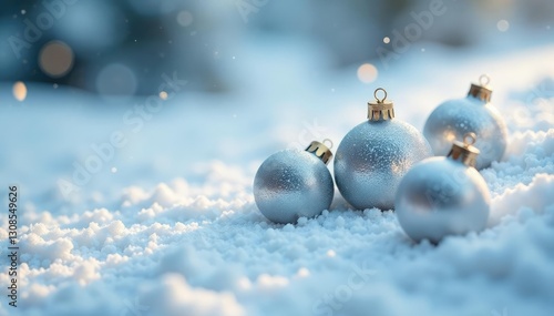 Sparkling silver ornaments scattered on a pristine snowy surface, winter wonderland, snowball decorations, holiday decor