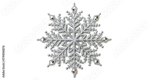 Sparkling silver snowflake ornament with glitter and reflective accents, isolated on a white background, symbolizing winter holidays.