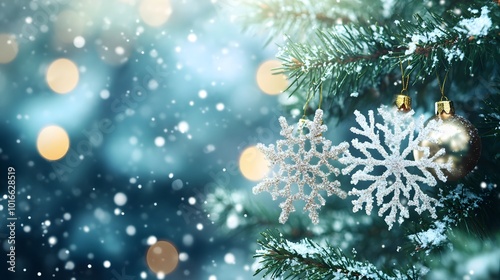 Sparkling Snowflakes and a Golden Ornament on a Snowy Evergreen Branch