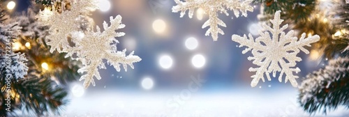Sparkling Snowflakes and Bokeh Lights on a Christmas Tree Branch, Winter Holiday Background