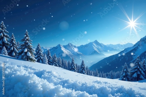 Sparkling snowflakes falling on a snowy mountain landscape, sparkly, falling, mountain