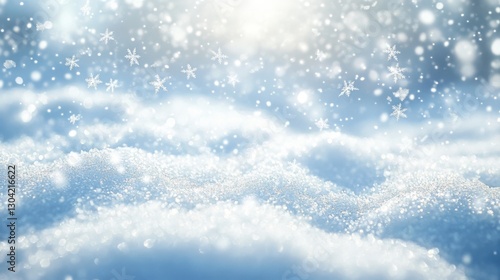 Sparkling snowflakes glistening on fresh snow in sunlight