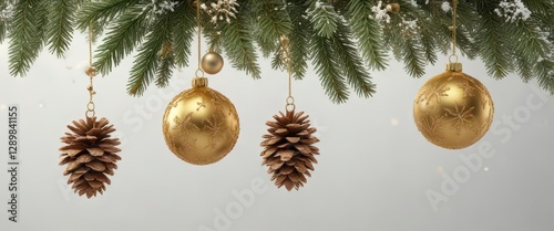 Sparkling snowflakes hanging from a branch with gold ornaments and pinecones isolated on white background, christmas elements, snowflake