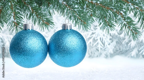 Sparkling Teal Christmas Ornaments on Snowy Pine Branch