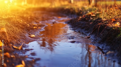Sparkling water flows through a peaceful autumn landscape at sunset