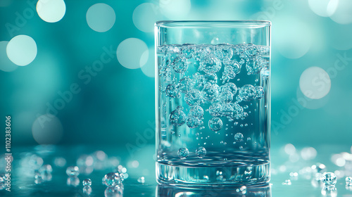 Sparkling Water Glass Bubbles Refreshing Drink Closeup Teal Background