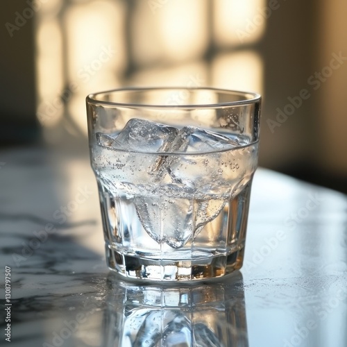 Sparkling water with ice in a glass on a marble table.