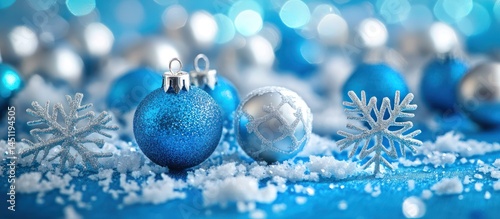 Sparkling winter wonderland: Festive blue and silver ornaments with bokeh lights
