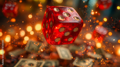 Sparks flying as red dice land on money, capturing the thrill and uncertainty of gambling