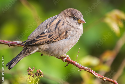 Sparrow sitting on a green branch in autumn. Sparrow with playful poise on branch in autumn or summer