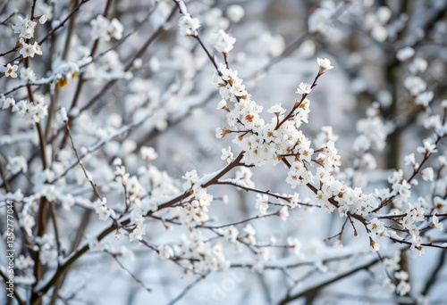 Sparse snow-covered branches, delicate white blossoms, soft light, frosty, cold