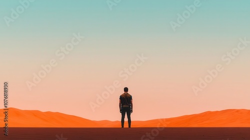 Spartan warrior standing alone in a vast desert, his bronze armor glowing in the midday sun