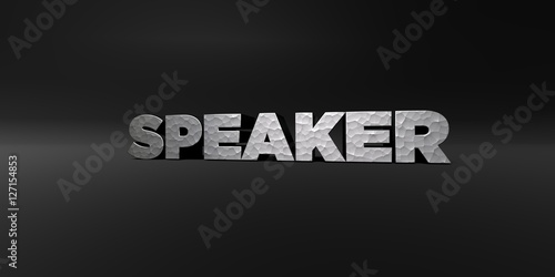 SPEAKER - hammered metal finish text on black studio - 3D rendered royalty free stock photo. This image can be used for an online website banner ad or a print postcard.