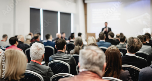 Speaker giving a talk in conference hall at business event. Rear view of unrecognizable people in audience at the conference hall. Business and entrepreneurship concept.