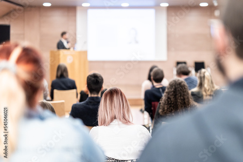 Speaker giving a talk in conference hall at business event. Rear view of unrecognizable people in audience at the conference hall. Business and entrepreneurship concept