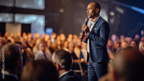 Speaker performing on stage with spotlight talking to many people in audience, event professional.