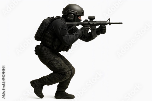 Special forces soldier in tactical gear aims rifle during training exercise in urban environment focusing on precision and teamwork