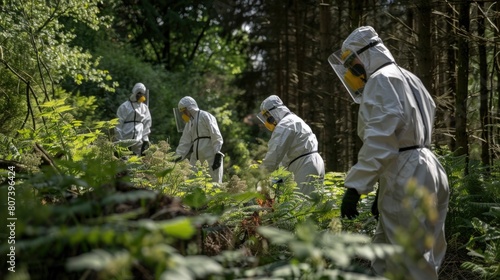 Specialists or workers in protective suits using specialized equipment to combat dangerous Giant Hogweed