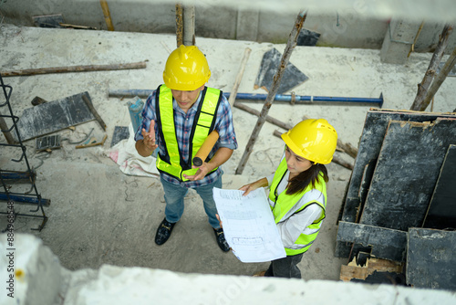 Specialists team in safety vest and helmet discussing structure of the building at construction site
