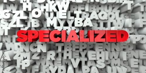 SPECIALIZED - Red text on typography background - 3D rendered royalty free stock image. This image can be used for an online website banner ad or a print postcard.