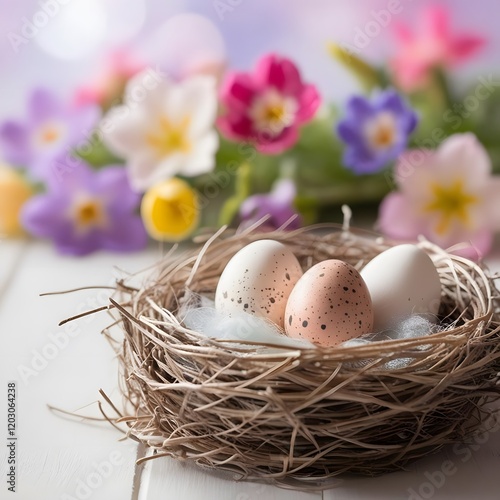 Speckled Eggs in Nest with Flowers Soft Background Springtime Decor