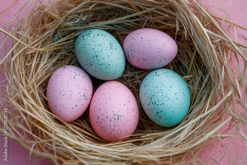 Speckled Pastel Easter Eggs in a Rustic Nest on Pink Background – Spring Holiday Decoration