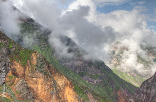 Spectacular and amazing beautiful panorama of the Andes Mountains in the Colca Canyon, Peru. White clouds, wonderful cloudscape. Cliff, blue sky. HDR