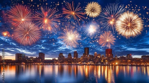 Spectacular Boston Harbor Fireworks Display with Skyline Reflections and Waterfront Celebration