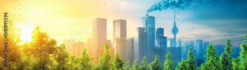 Spectacular cityscape at dusk, modern architecture against a fiery sunset sky modern