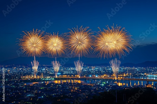 Spectacular fireworks display lights up the night sky over a bustling city by the river