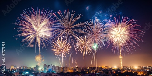 Spectacular fireworks lighting up the night sky above an urban skyline, symbolizing celebration and festivities