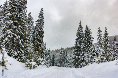 Spectacular panorama is opened on mountains, trees covered with white snow, lawn and blue sky with clouds.