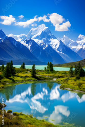 Spectacular Panorama of Untouched Wilderness: Lake, Foliage, and Snow-Capped Mountains