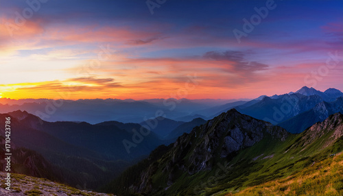 Spectacular Panoramic Landscape Of Mountain Ranges At Sunset With Dynamic Sky Illumination And Color Gradient