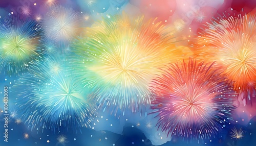 Spectacular Rainbow Fireworks Display: A vibrant watercolor illustration of a breathtaking fireworks show, bursting with color and energy, celebrating a joyous occasion.