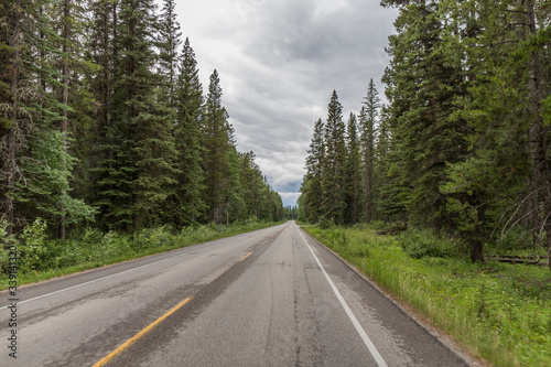 Spectacular road landscapes that run through pine forests and high mountains, Canadian roads with the yellow lines
