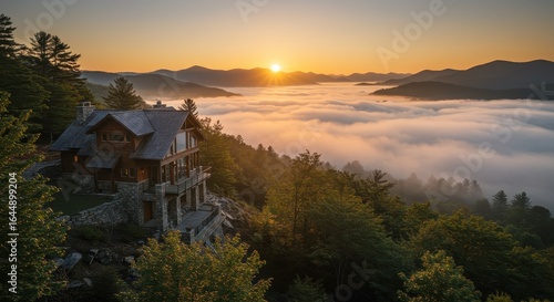 Spectacular sunrise illuminates luxury mountain home embraced by swirling cloudscape