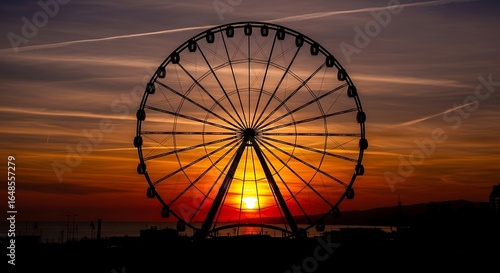 Spectacular sunset silhouette: Majestic Ferris wheel against twilight skies with serene horizon