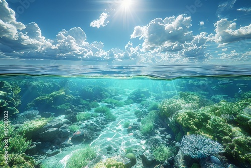 Spectacular Underwater Coral Reef with Vibrant Marine Life Under Clear Blue Skies and Sunlight Streaming Through Crystal Clear WaterUnderwater