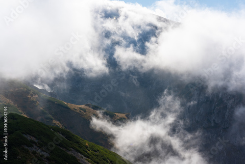 Spectacular view of a misty mountain valley covered with thick clouds on a sunny day. Concept of pristine nature, wilderness, and alpine adventure. High quality photo